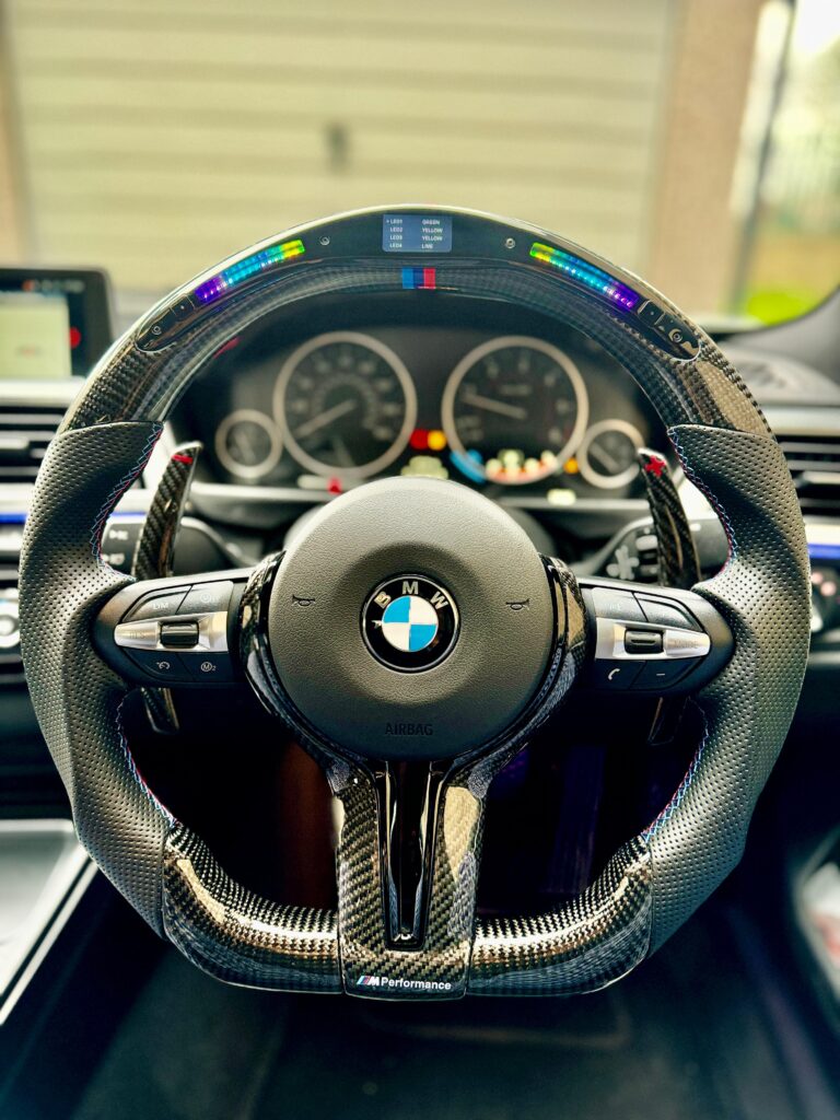 BMW LED Steering Wheel, Dry Carbon Fibre with Flat Bottom, Perforated Leather Grip